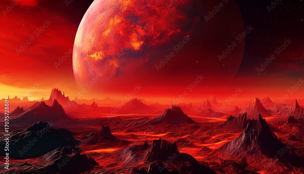 Alien planet landscape with a large red moon and fiery mountains fiery landscape volcanic terrain #1707572888