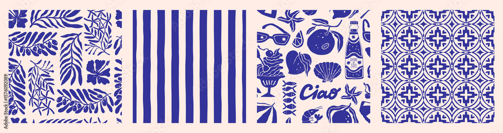 • #1576092089 Amalfi coast hand-drawn seamless pattern collection: florals, coastal, stripes and tiles. Retro vibes in naive Mediterranean style. Perfect for fabric, kitchen decor, wrapping, and summer food design.