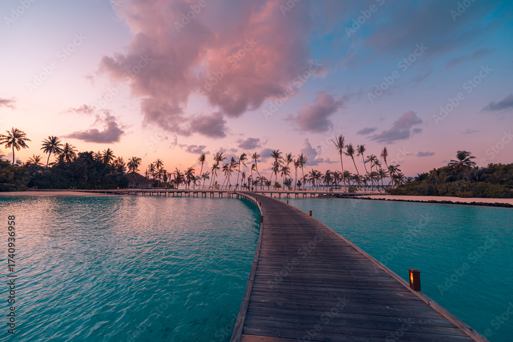 Amazing sunset panorama at Maldives. Luxury resort villas seascape with soft led lights under colorful sky. Beautiful twilight sky and colorful clouds. Beautiful beach background for vacation holiday #1740936958