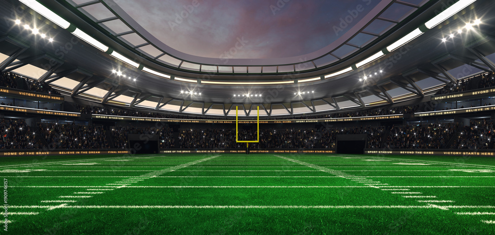 American football field at a sports stadium with shining spotlights and fans ready for the upcoming grand sporting event. Professional sports advertisement background. #1909746157