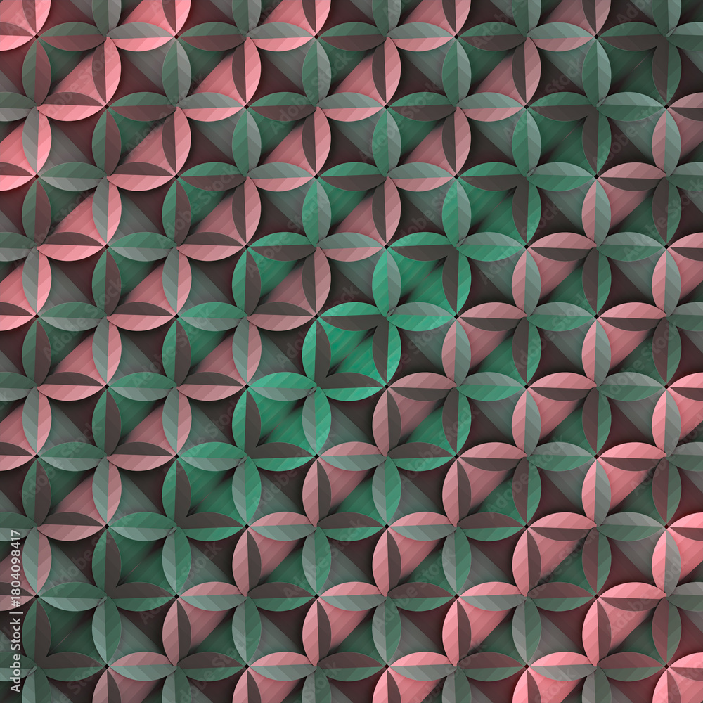 An abstract 3D background with a geometric pattern of overlapping circles. An unusual pixel gradient in pink and green tones. A modern, elegant background #1804098417