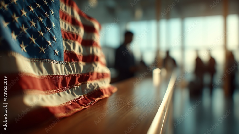 An American flag is prominently displayed on a table, illuminated by natural light. The American flag gently folds as silhouettes of people appear in the blurred background. #1739532019