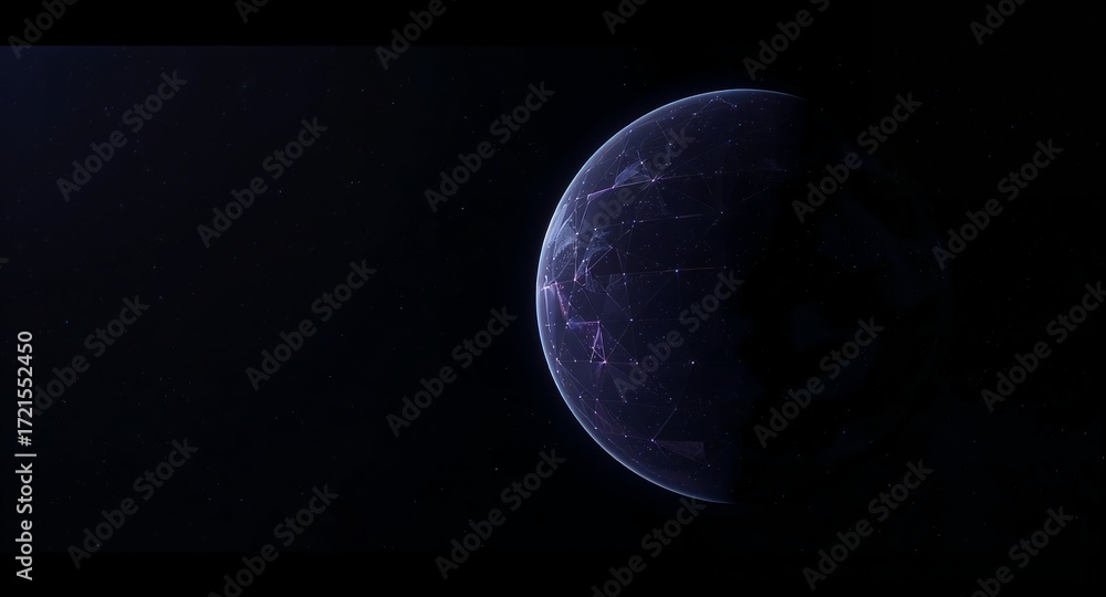 An elegant, minimalist 3D render of a planet with a glowing, geometric grid on its surface. It floats in dark, empty space. Symbolizes global technology, data, and exploration #1721552450