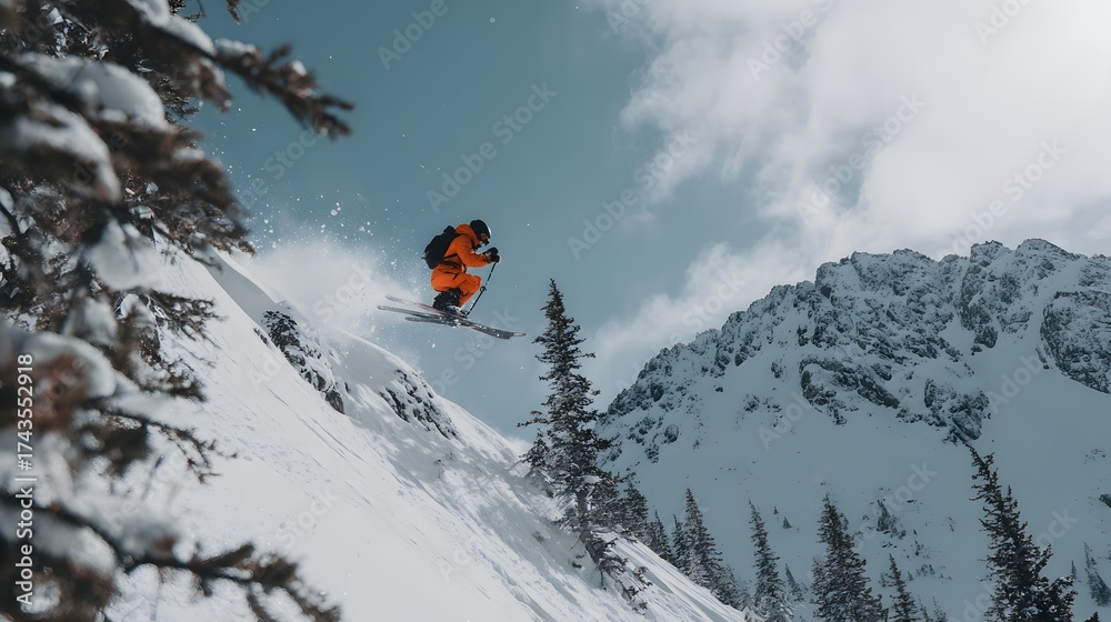 An exhilarating image displays a skier mid-air, leaping over a snowy ridge, showcasing winter sports in a mountain landscape. #1743552918