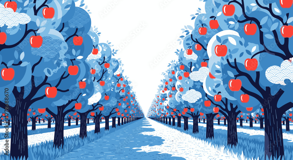 An illustration of an apple orchard with blue trees and vibrant red apples stretching into the distance. #1778688670
