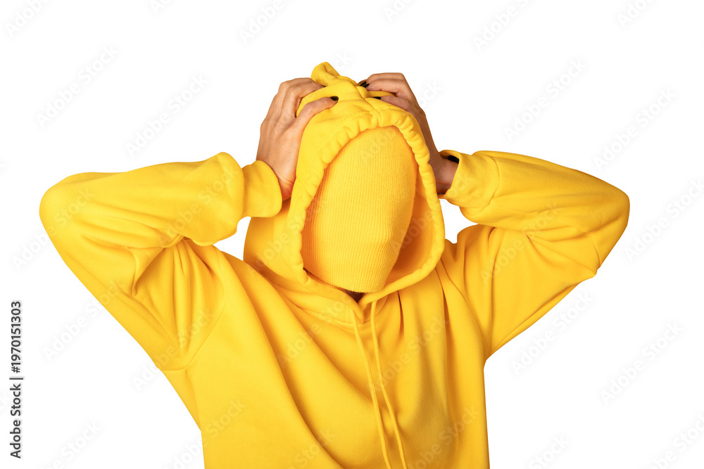Anonymous person in a bright yellow hoodie with covered face, hands on head, isolated on transparent background, concept of identity or anonymity. #1970151303
