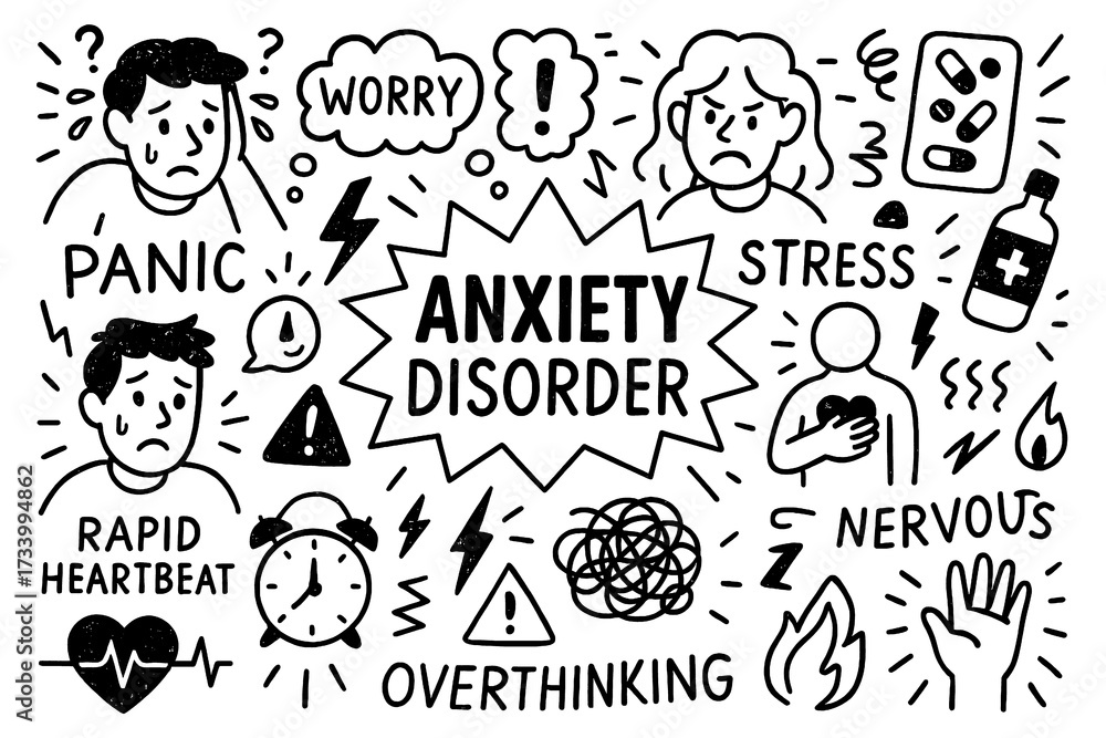 anxiety disorder concept with stressed faces, worry pills and brain doodle icons, Transparent Background #1733994862