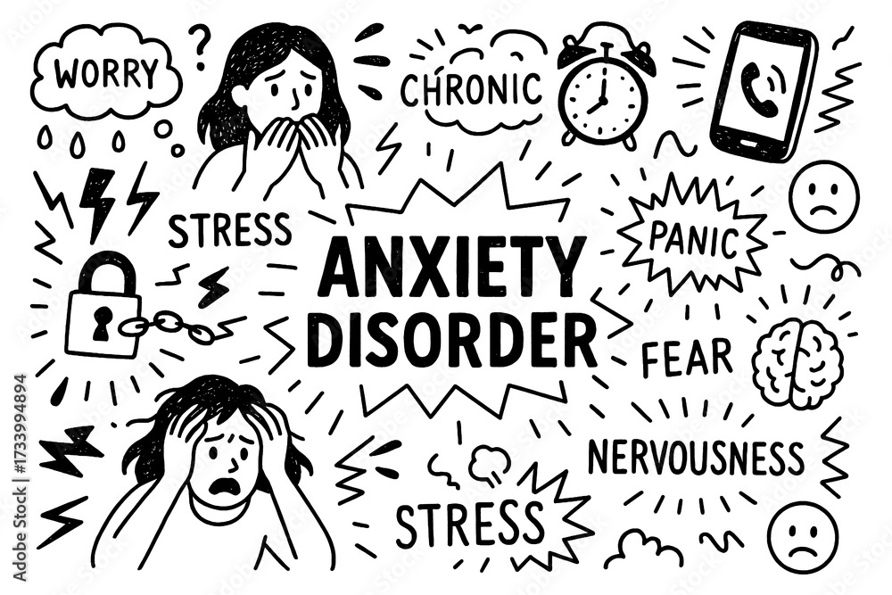anxiety disorder concept with stressed faces, worry pills and brain doodle icons, Transparent Background #1733994894