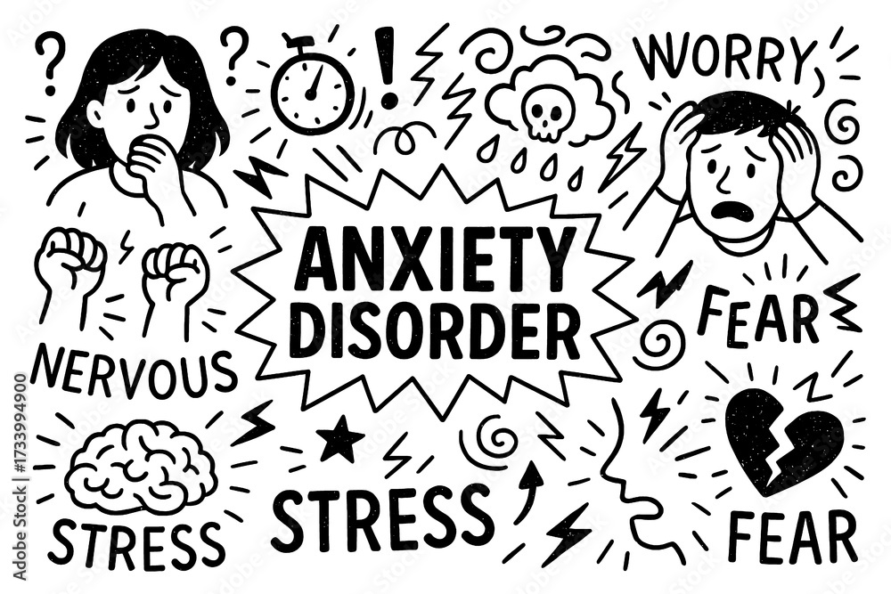 anxiety disorder concept with stressed faces, worry pills and brain doodle icons, Transparent Background #1733994900