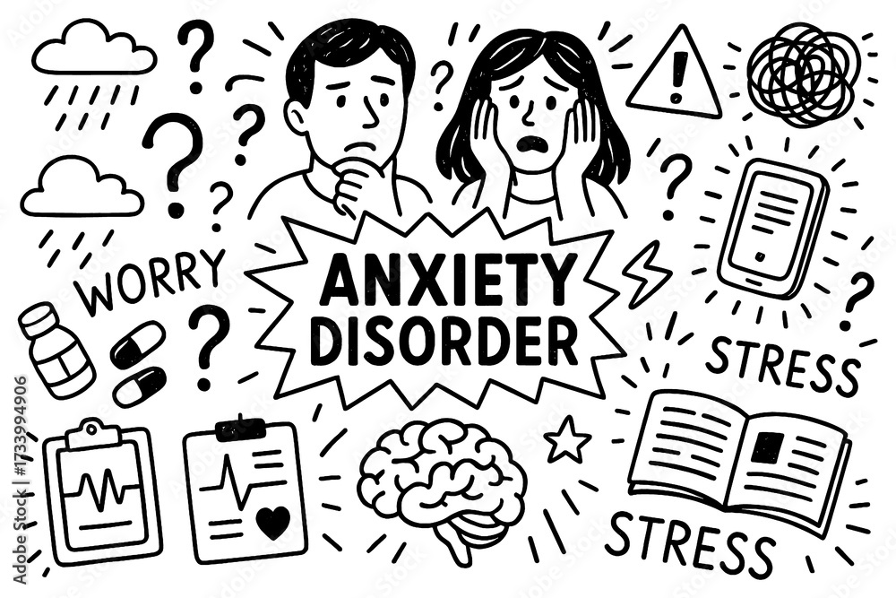 anxiety disorder concept with stressed faces, worry pills and brain doodle icons, Transparent Background #1733994906