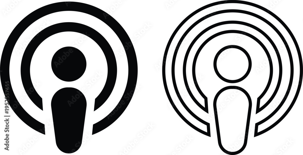 Apple podcast app flat and outline icon set. Logo options for audio streaming, mobile interface and media branding design. Digital social media vectors illustration isolated on transparent background. #1952557655