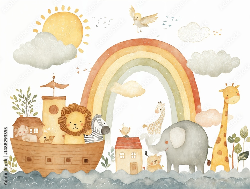 Arcoíris, animales, barco, casa, sol, nubes, acuarela, infantil, ilustración. #1488293355