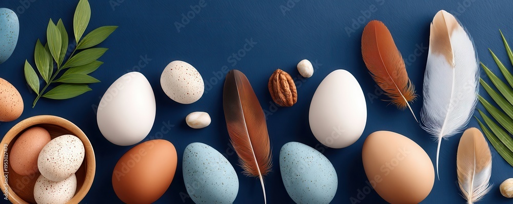 Arrangement of eggs and feathers on a dark blue background for Easter and spring decor #1953027479