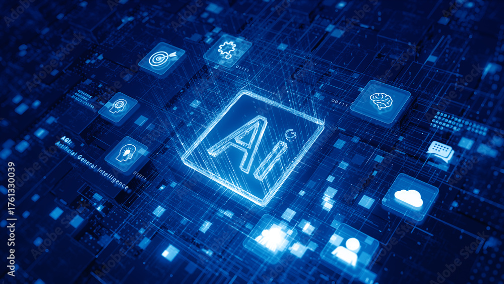 Artificial Intelligence microchip with digital interface icons on blue futuristic circuit board, AGI and data network concept. 3d Rendering #1761330039