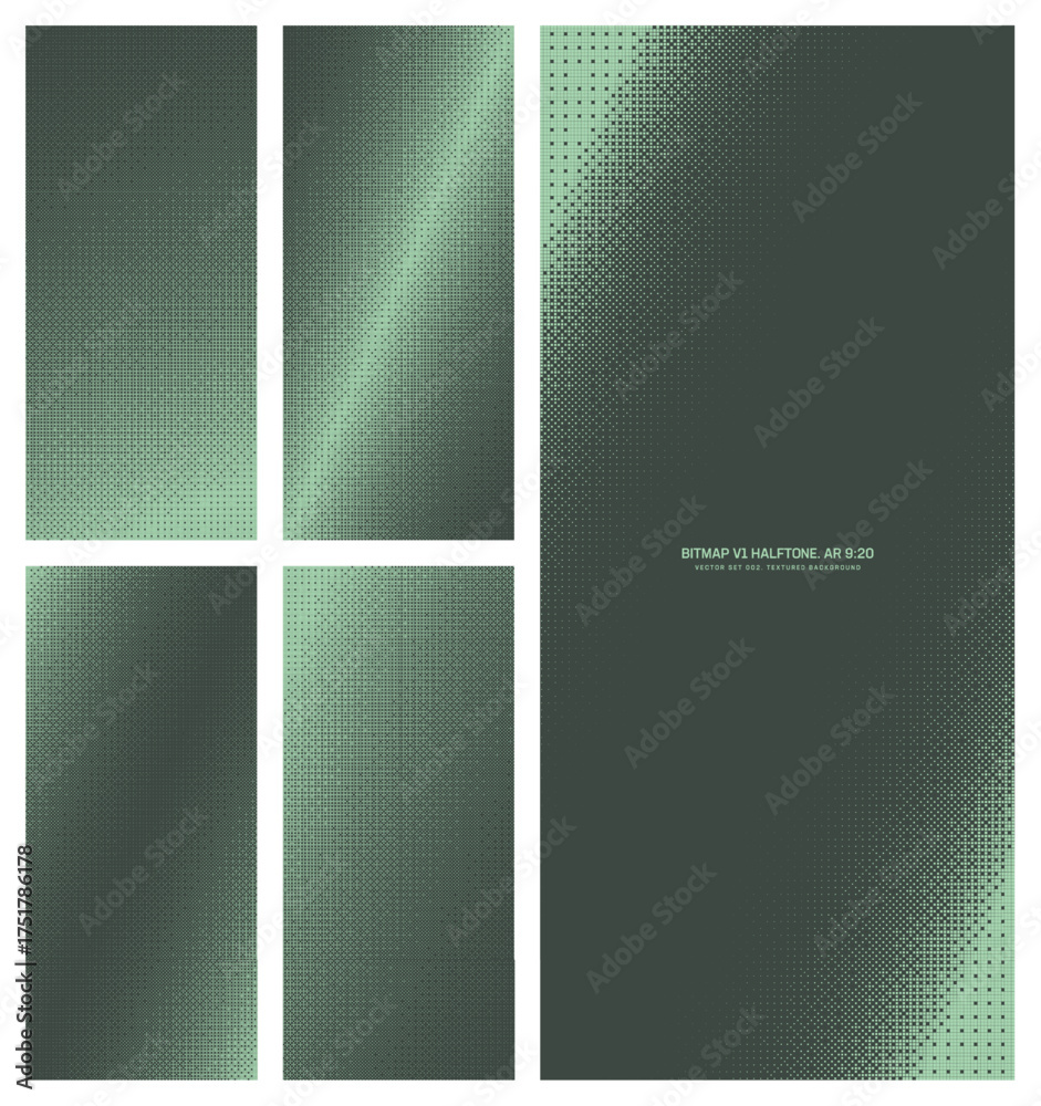 Assorted vector bitmap dark green halftone pattern set in vertical 9:20 aspect ratio including diagonal faded frame and various tilted textures. Varied 8 bit retro style graphic textured design bundle #1751786178