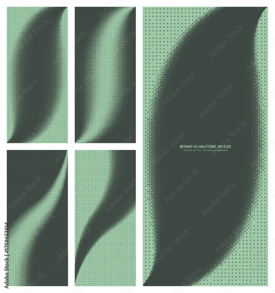 Assorted vector bitmap sage green halftone pattern set in vertical 9:20 aspect ratio including curved frame and various twisted textures. Varied 8bit retro futuristic style design elements bundle #1759653514