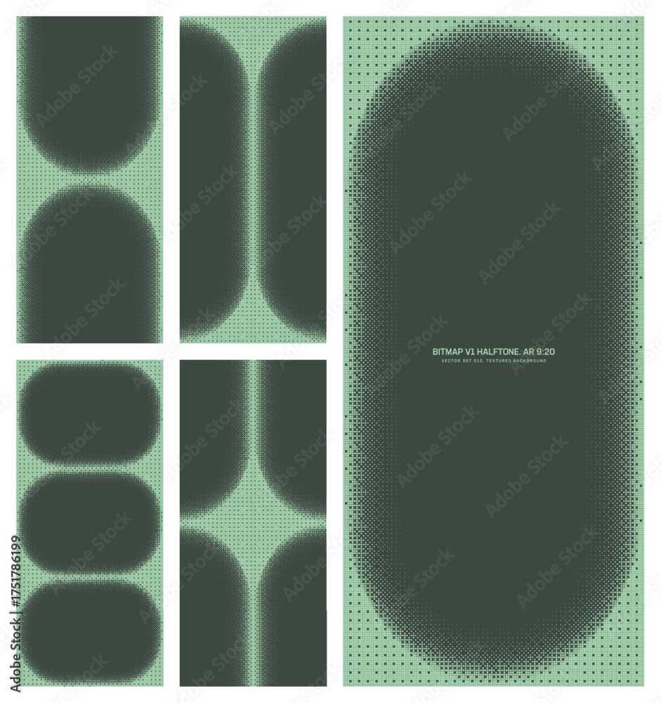 Assorted vector bitmap sage green halftone pattern set in vertical 9:20 aspect ratio including rounded frame and various unique textures. Varied 8 bit retro styled textured design elements bundle #1751786199