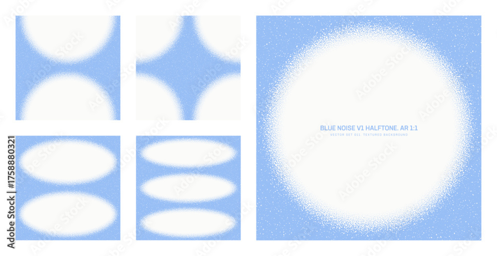 Assorted vector blue noise halftone pattern set in square 1:1 aspect ratio including circle frame and various granular textures. Varied half tone graphic grainy textured design element collection #1758880321