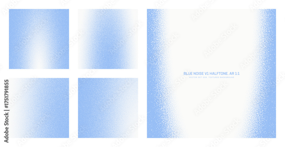 Assorted vector blue noise halftone pattern set in square 1:1 aspect ratio including elliptical frame and various smooth blurred textures. Different half tone grainy texture design elements collection #1751791855