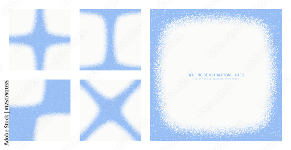 Assorted vector blue noise halftone pattern set in square 1:1 aspect ratio including rounded frame and various unique textures. Miscellaneous half tone graphic grainy texture design element collection #1751792035