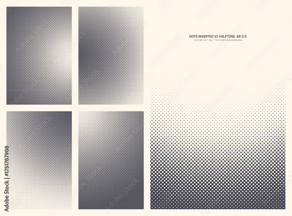 Assorted vector retro styled inverted dots halftone pattern set in vertical 2:3 aspect ratio including round smooth blurred border and various radial textures. Varied offset print design elements #1751787908