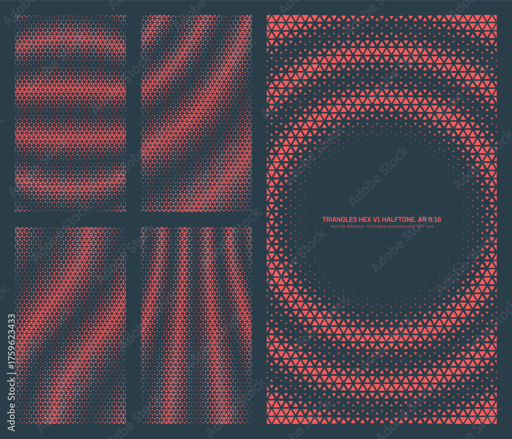 Assorted vector triangles hexagonal grid red black halftone pattern set in vertical 9:16 aspect ratio including circular frame and various striped textures. Retro futuristic design element bundle #1759623433