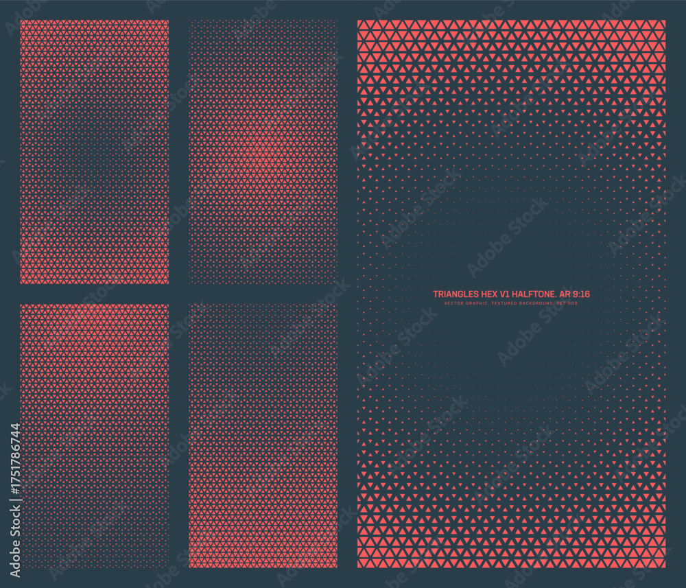 Assorted vector triangles hexagonal grid red black halftone pattern set in vertical 9:16 aspect ratio including round smooth blurred frame and various radial textures. Half tone texture design element #1751786744