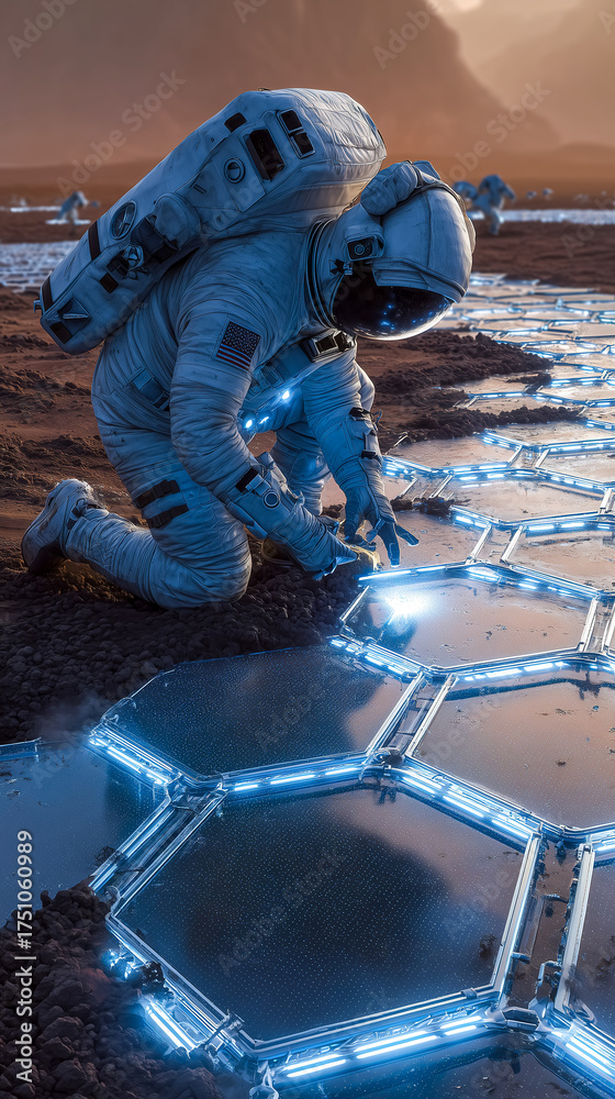 Astronaut explores illuminated hexagonal structures on alien landscape during twilight in a distant planet #1751060989