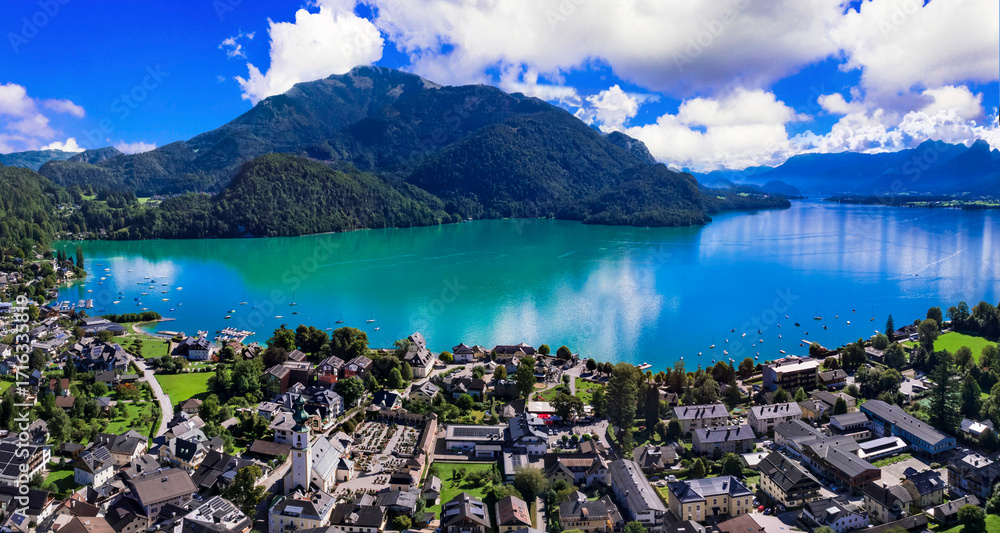Austria tourism and most scenic places. wonderful turquoise lake Wofgangsee (Wolfgang) and beautiful village Sankt Gilgen surrounded by alps mountains austrian travel in Salzkammergut #1716335819