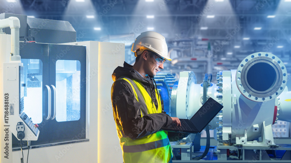 Automated production. Man at modern industrial enterprise. Industrialist with laptop in his hands. Factory engineer standing with computer. Man at gas turbine plant. Automated production engineer #1718488103