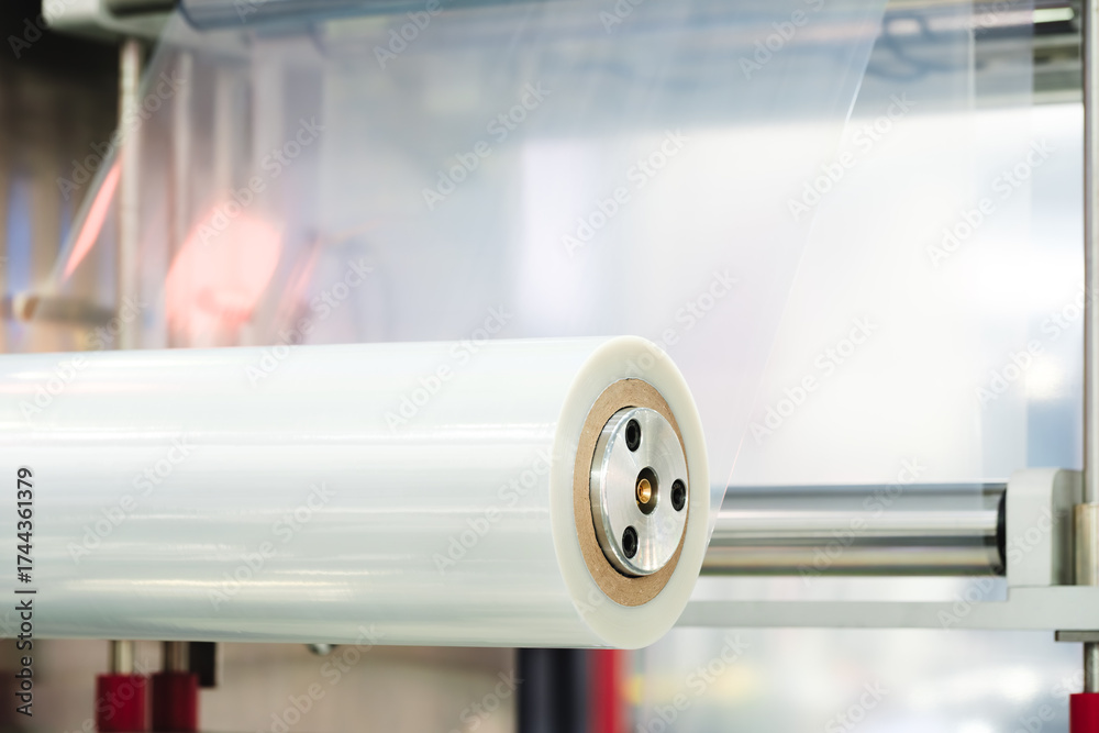 Automatic polyethylene plastic bag production machine with lighting effect. Close-up of the roller of the plastic bag production machine in the light blue scene. product packaging concept #1744361379