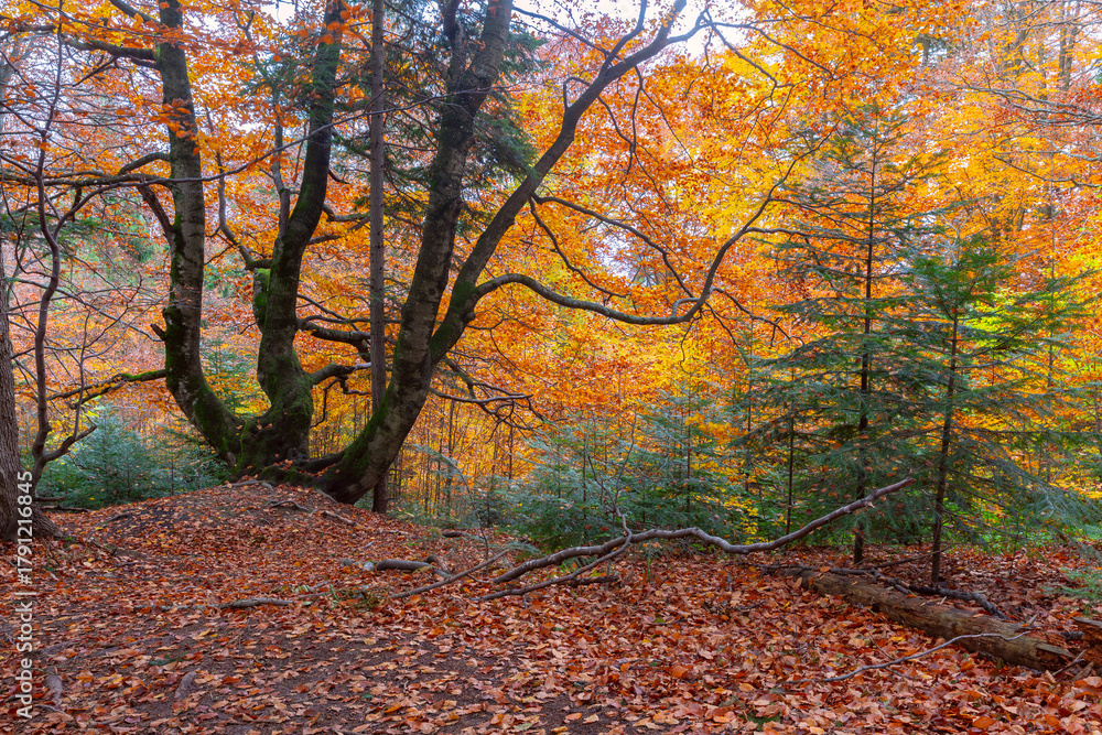 Autumn forest along hiking trail to Parashka Mountain near Skole town in Lviv region, Ukraine #1791216845