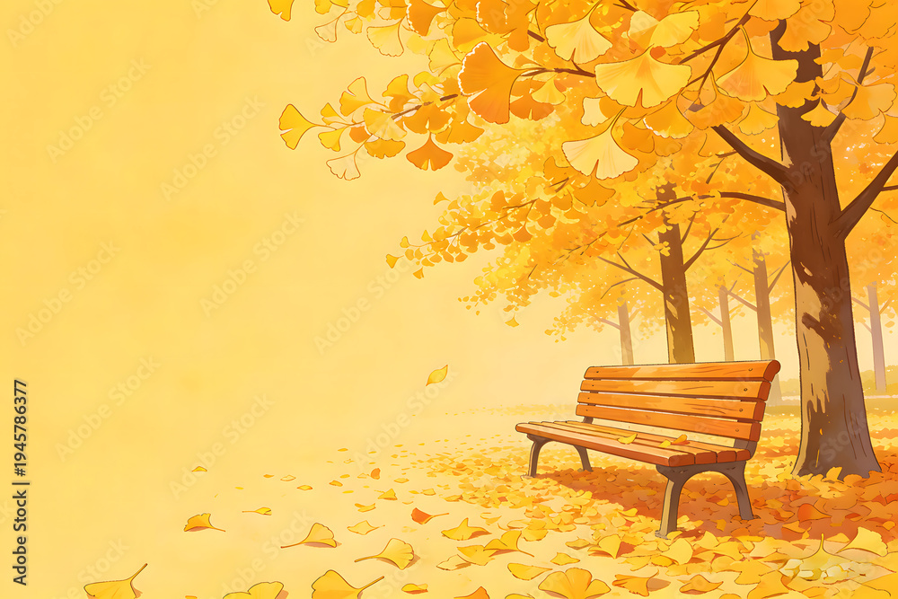 Autumn ginkgo tree with golden leaves and wooden bench on yellow background #1945786377