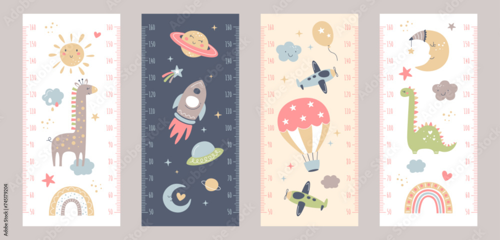 Baby height growth chart with cute animals, rainbow, cloud, sun, moon, balloon, rocket and galaxy space in boho cartoon style. Childish meter wall, kids measuring ruler for nursery vector illustration #745179204