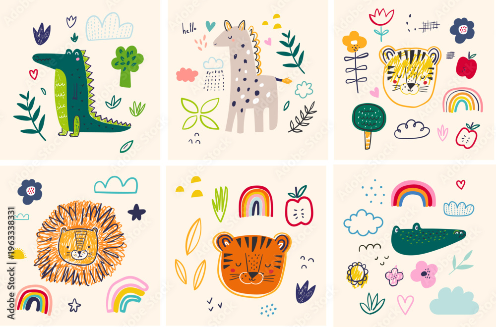 Baby Prints. Baby hand drawn design for textile, posters, cards. Vector illustration with cute animals #1963338331