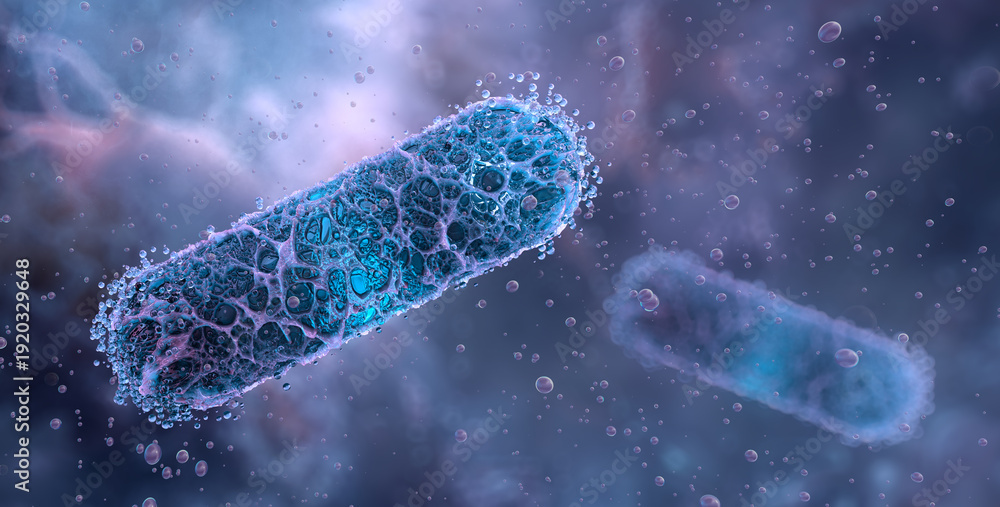 Bacillus subtilis bacterium in hydrated extracellular biofilm matrix. Enzyme production proteases, amylases, fermentation technology, probiotic development. Industrial biotechnology, synthetic biology #1920329648