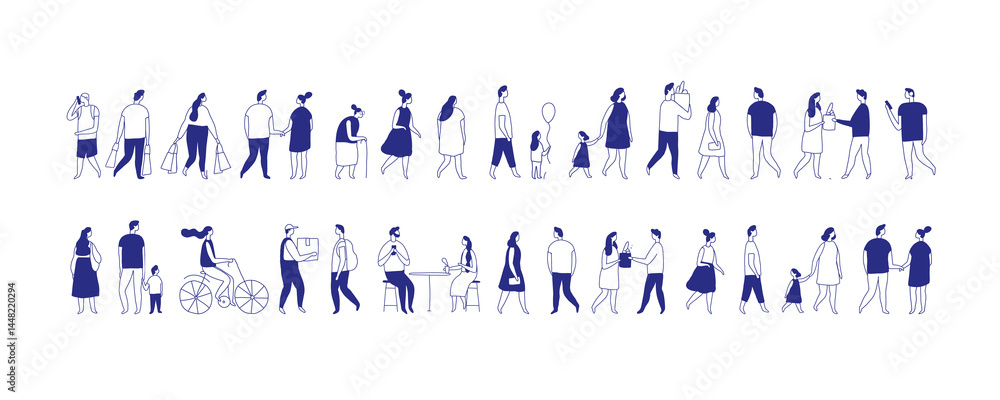 Background stylized people silhouette line vector set isolated on white. People crowd. Men and women, kids walking outdoor. Contour, drawing, people, character #1448220294