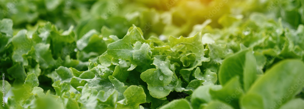 Banner fresh green organic hydroponic vegetable plantation produce salad hydroponic farm. Panorama Green oak lettuce salad in Organic Farm. Salad farm vegetable green oak lettuce with copy space #1768844534