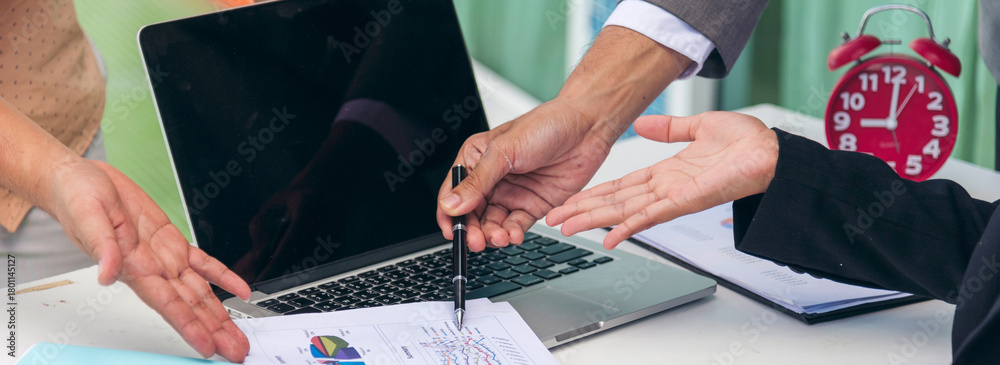 Banner Two businesspeople meeting work at office desk. Teamwork partners team with Business strategy chart graph, infographic financial report. Team partner planning excel stat report with copy space #1801145127