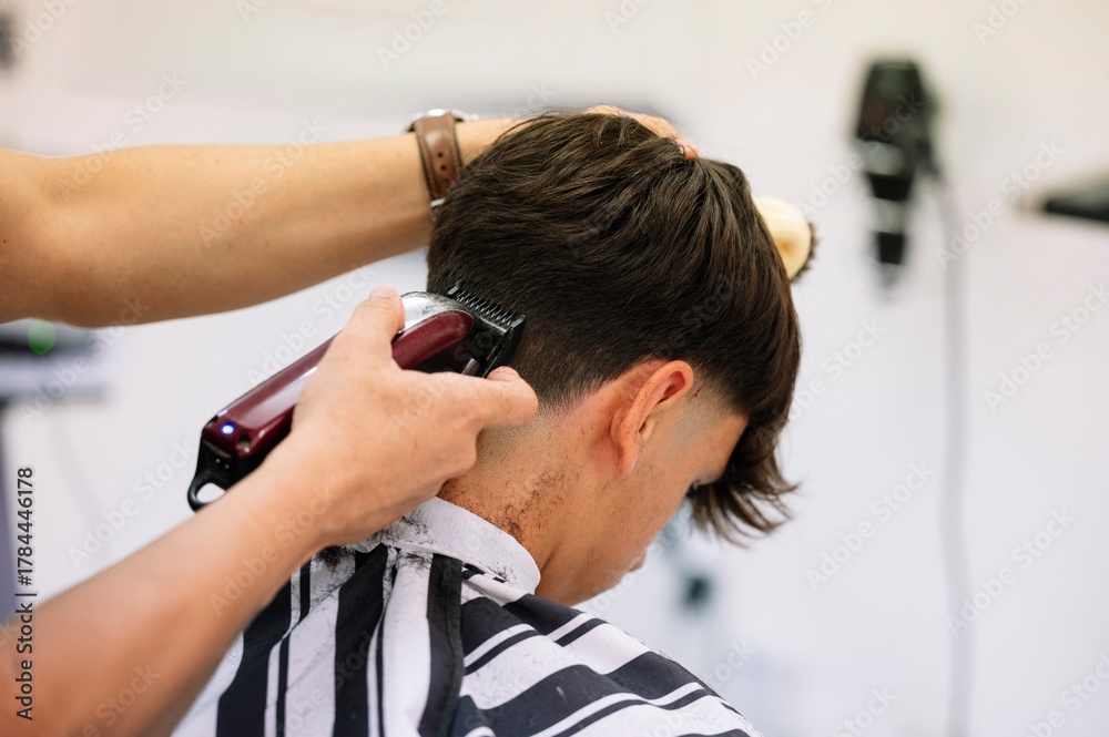 Barber finishing fade haircut on young man. #1784446178