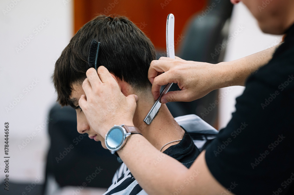 Barber shaping neckline with straight razor. #1784446563