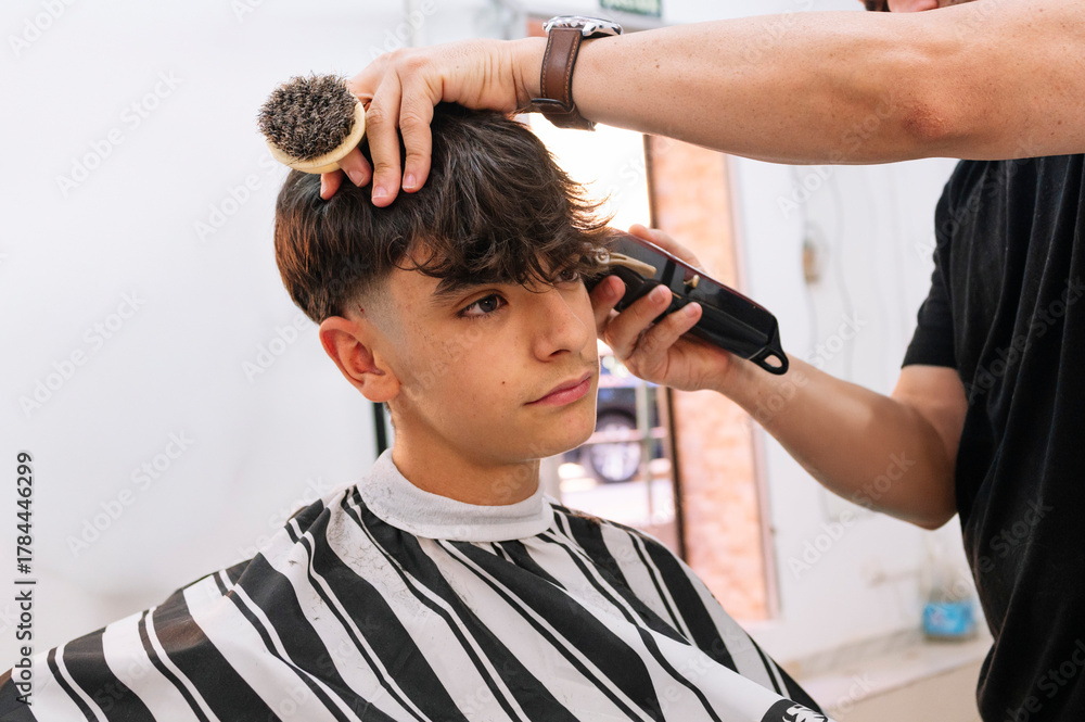 Barber trimming young man's hair with clipper. #1784446299