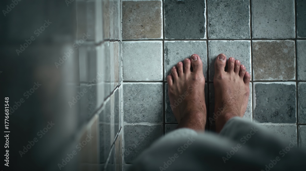 Bare feet on ceramic tiled bathroom floor with symmetrical pattern and neutral tones #1776681548
