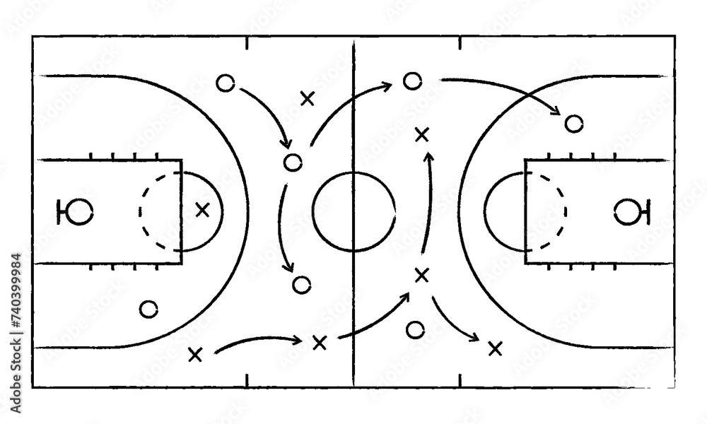 Basketball strategy field, game tactic chalkboard template. Hand drawn basketball game scheme, learning board, sport plan vector illustration #740399984