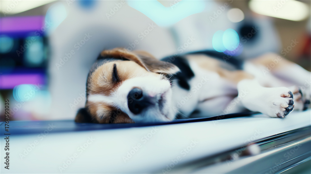 Beagle dog sleeping peacefully on table under soft light, concept of relaxation, comfort and pet companionship. #1767591035