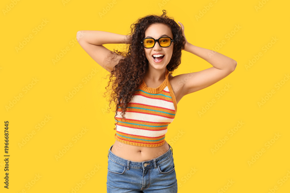 Beautiful African-American woman with sunglasses on yellow background #1966687445