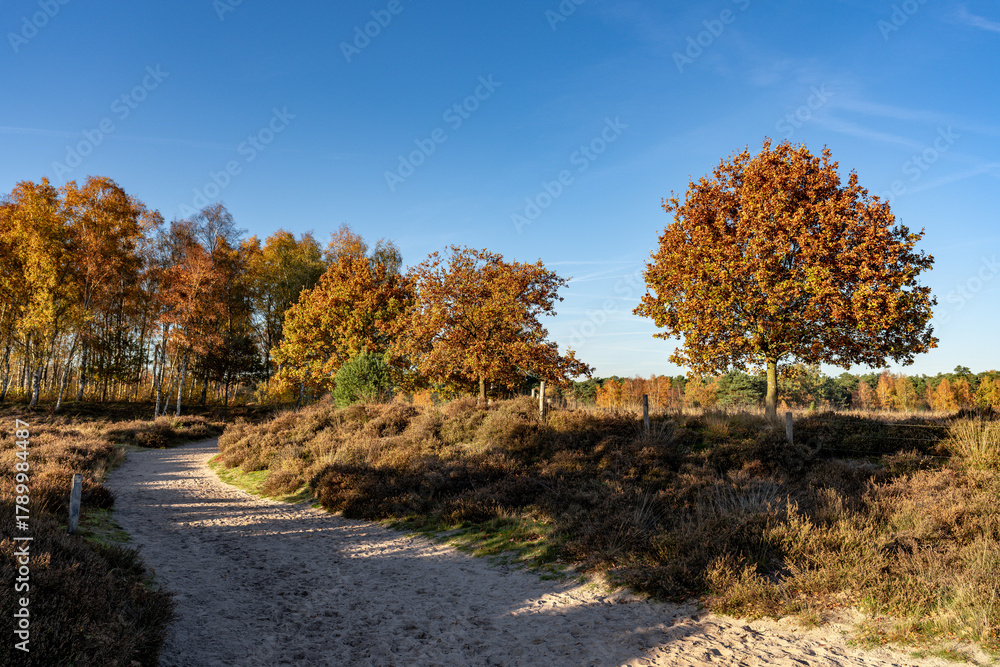 Beautiful autumn colours on Dutch heath during fall with soft golden light #1789984487