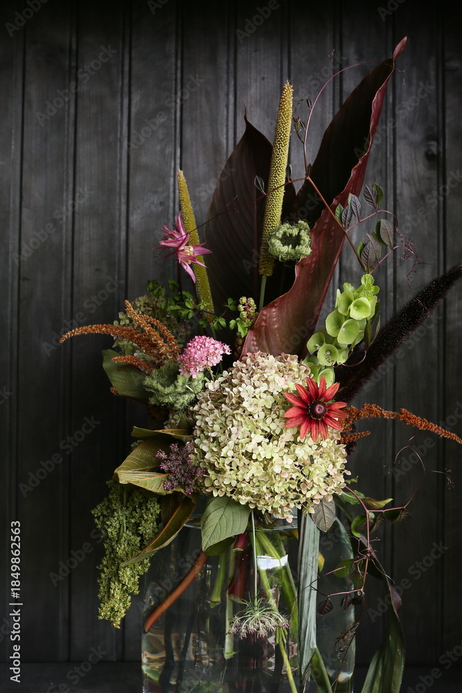 Beautiful bouquet of wildflowers on a black background, dark photo. Vertical photo. #1849862563