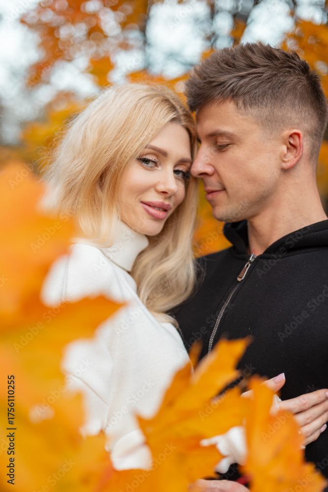 Beautiful couple blonde woman and handsome man in fashionable clothes hugging in autumn park with yellow leaves. Couple in love. Fall colored portrait #1756110255