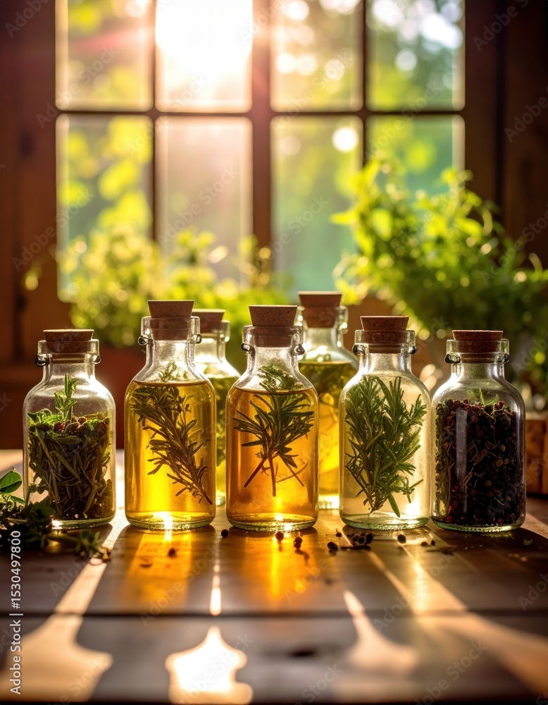 Beautiful glass bottles filled with aromatic herbs and spices on wooden table in sunlit room #1530497800